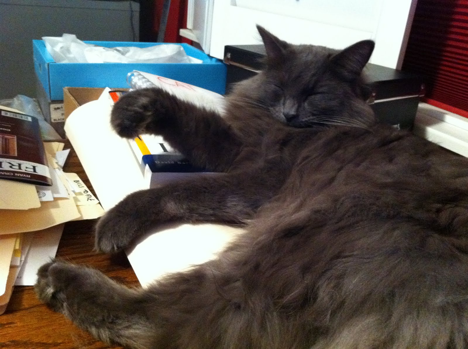 | I moved my snoozing operation center to my guy owner's office. It's pretty messy, but I can sleep anywhere! |