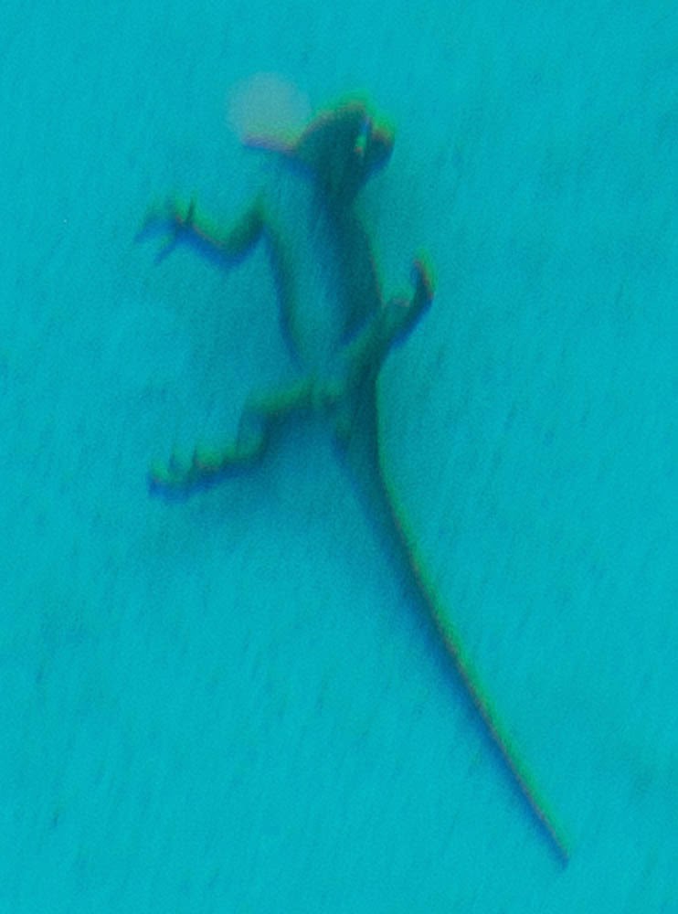It was a lizard. There's a bazillion lizards around here. The surveillance system around this place is woefully inadequate for the needs of our operation at this facility (house) and so there are no photos of me chasing the lizard. But that's what I did and I employed a tried and true method of pursuit - chasing my prey into the swimming pool! The forensic photo evidence below shows his ultimate resting place - about 12 feet underwater! You gotta admit, that's pretty funny. The photo isn't up to my usual standards of quality but that's the problem of taking a picture of something dead at the bottom of the pool.